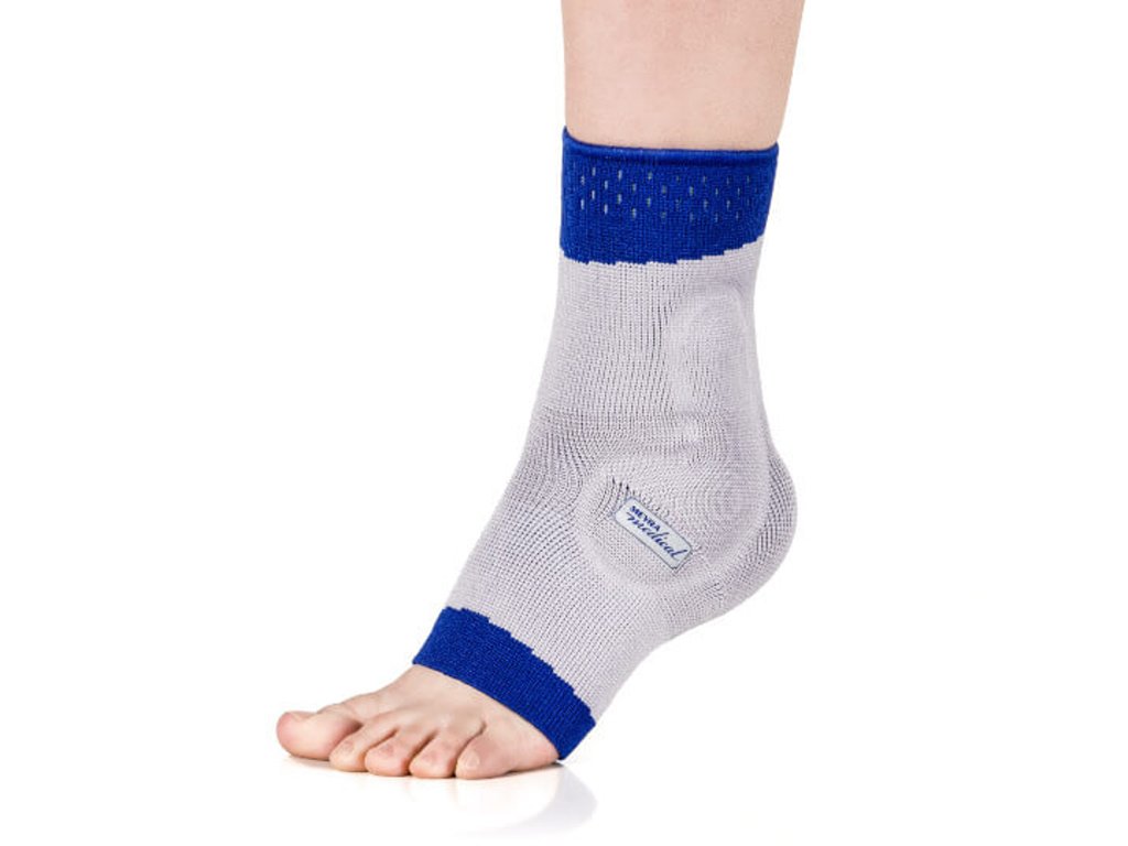 Bandáž hlezenního kloubu z elastického materiálu se silikonovými tlakovými výztuhami.
