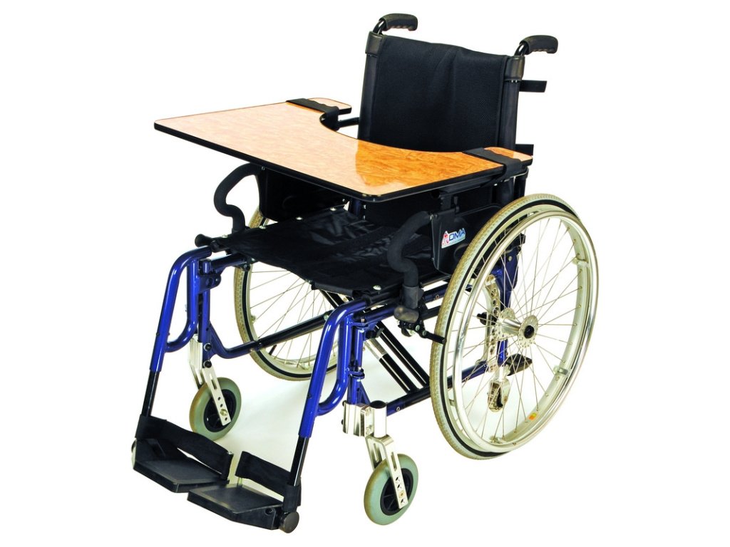 Stolek lze jednoduše a rychle upevnit na většinu vozíků pomocí suchého zipu přes postranice.