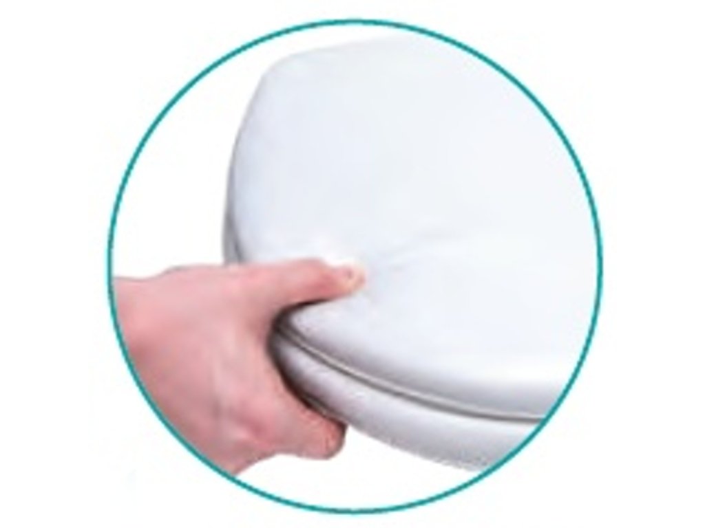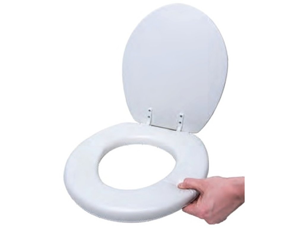 WC sedátko s plastovými úchyty a sedací částí, která je měkká a potažená PVC.